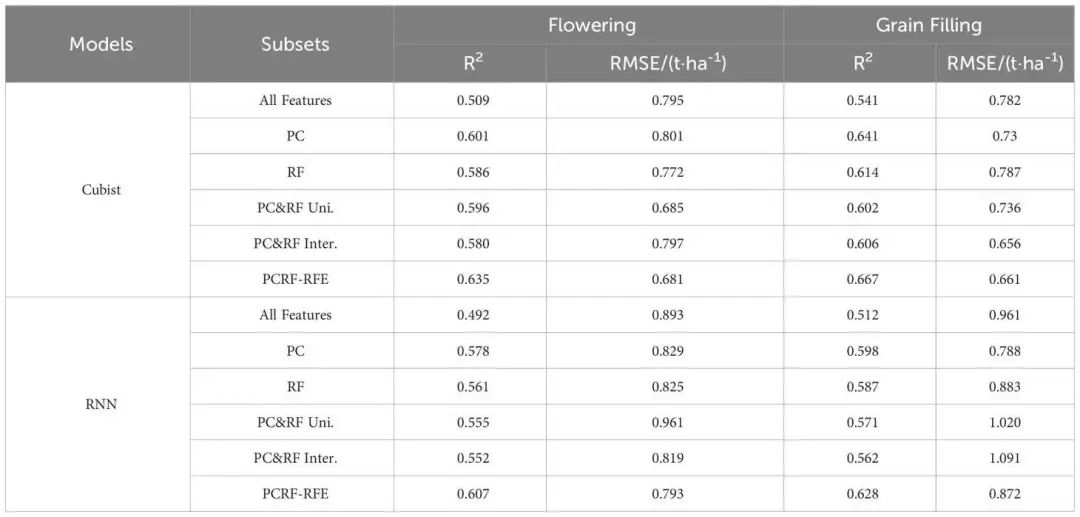 分别基于花期和灌浆期全部特征、利用主成分法和RF重要性法筛选出的特征子集以及提出的PCRF-RFE方法筛选出的特征子集,构建Cubist和RNN产量预测模型,预测模型精度如表中所示。基于花期PCRF-RFE方法筛选出的特征子集构建的Cubist产量预测模型精度最好。