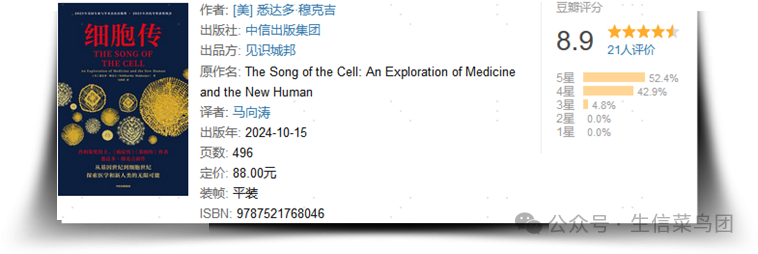 这一期和大家介绍的是《细胞传》。这是普利策奖得主悉达多·穆克吉继《癌症传》《基因传》之后的新作。书的腰封上写着: