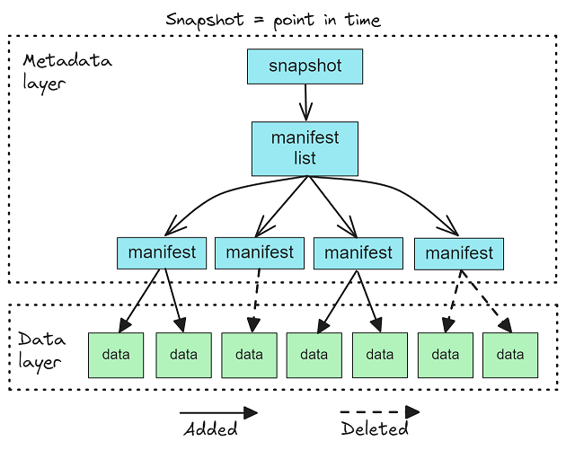 图 6.每个表版本都存储为快照。快照包含一个清单列表文件,该文件包含指向一组清单文件的条目列表。每个清单文件都包含一个条目列表,这些条目指向一组已添加、已删除或已存在的数据文件。