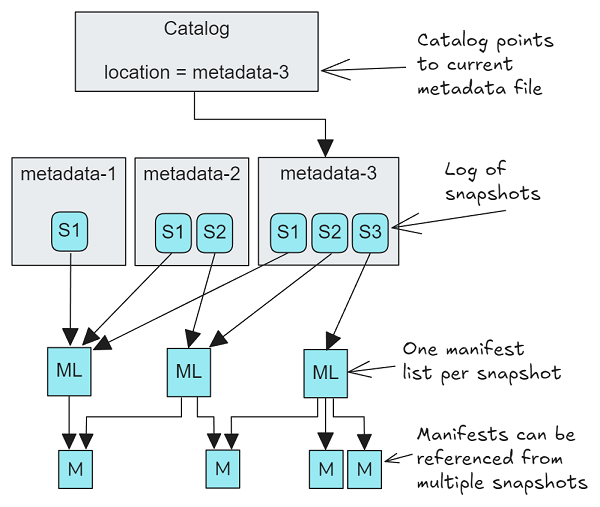 每次提交都会写入一个新的元数据文件,用于存储快照日志(新快照附加到末尾)和有关架构的信息。Iceberg 目录包含当前元数据文件的路径。