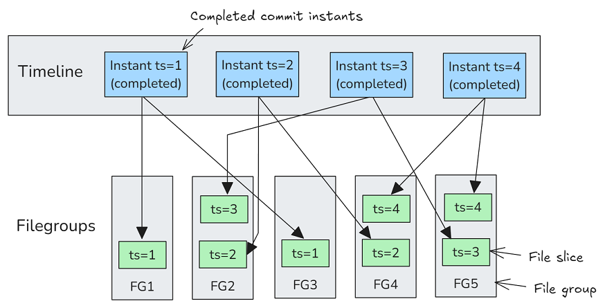 图 5.COW 表的 Apache Hudi 时间线。描述了一个包含 5 个文件组和已完成提交时刻日志的表,其中每个时刻都列出了一组添加的文件切片。此处省略了 requested 和 inflight 时刻。