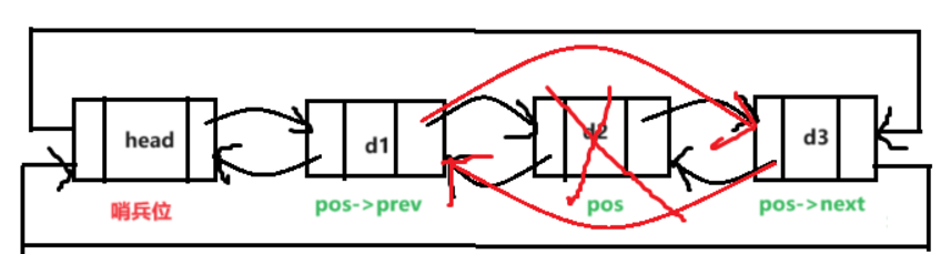 删除pos节点,需要把pos后一个结点的prev指针指向pos的前一个结点,把pos前一个结点的next指针指向pos的后一个节点,再释放pos结点。需要注意的是,函数的形参接受的是一级指针,形参的改变无法影响实参,也就是说,虽然我们在函数里把pos置为空了,但实参还没有置为空,因此,在调用完这个函数之后,还需要手动把实参置为空,否则实参就会成为一个野指针。