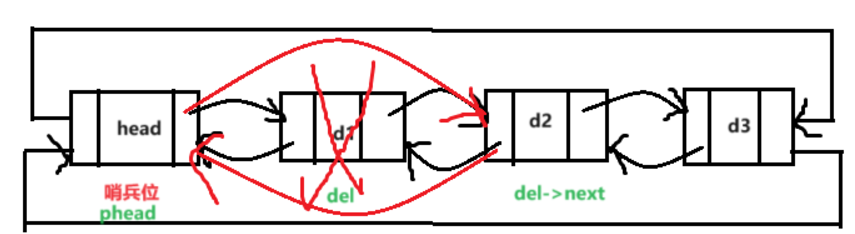 头删指的是删除第一个有效节点。对于头删,我们要使phead的next指针指向del的下一个结点,使del的下一个结点的prev指针指向哨兵位,再释放第一个有效节点。