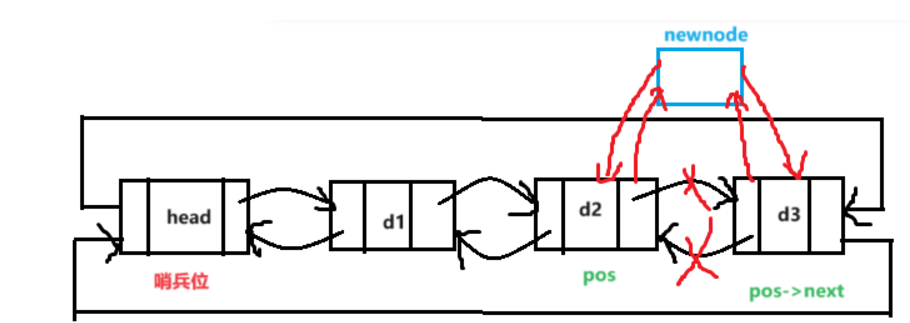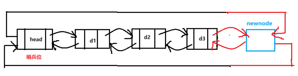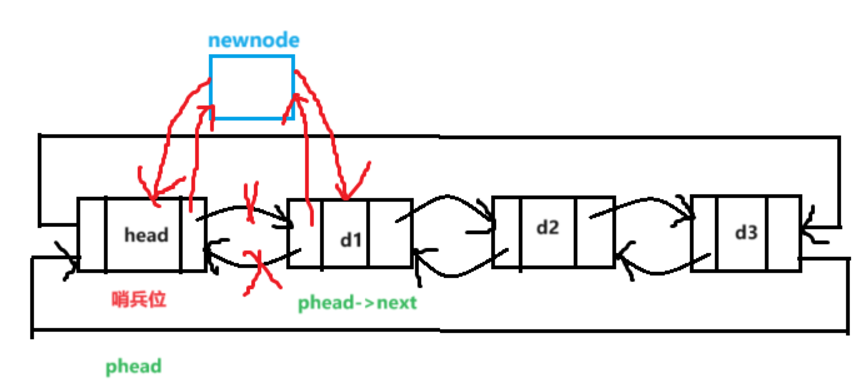 对于新插入的结点newnode,我们要让newnode的prev指针指向原来的尾结点d3,再让newnode的prev指针指向头结点。接下来我们要修改原来尾结点的next指针和头结点的prev指针。原来尾结点的next指针指向头结点,现在我们要让它指向newnode;哨兵位的prev指针原来指向d3,现在我们要让它指向newnode。需要注意的是,phead->prev->next = newnode和phead->prev = newnode不能交换位置。如果先执行phead->prev = newnode,那么在执行第二步phead->prev->next = newnode时就变成了newnode->next = newnode,这样就会出现问题。