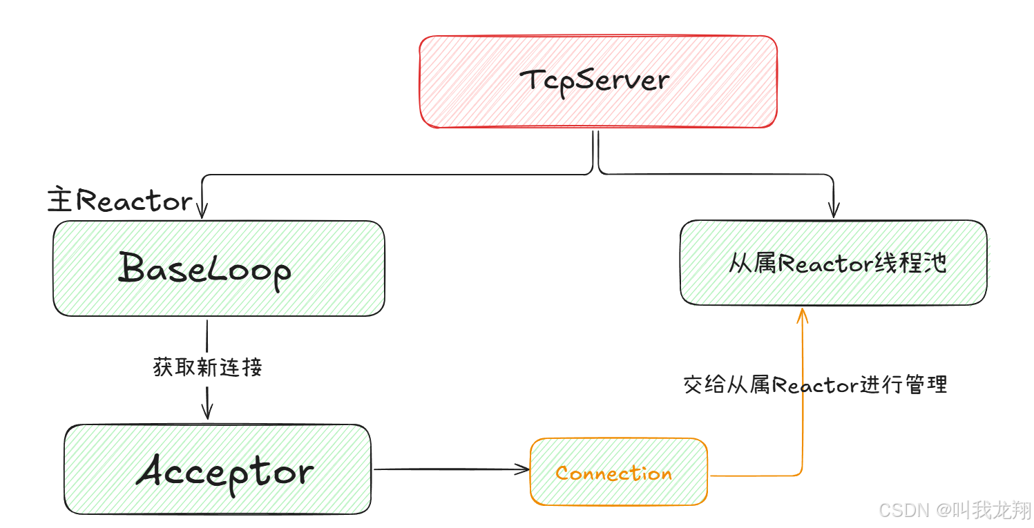 主要的工作就是搭建起主从Reactor模型,但是这个模型不是一下子就可以写出来的。为了实现主从Reactor模型,我们先需要实现一些基础类,对基础功能进封装,然后对这些功能进行整合,最终实现主从Reactor模型!