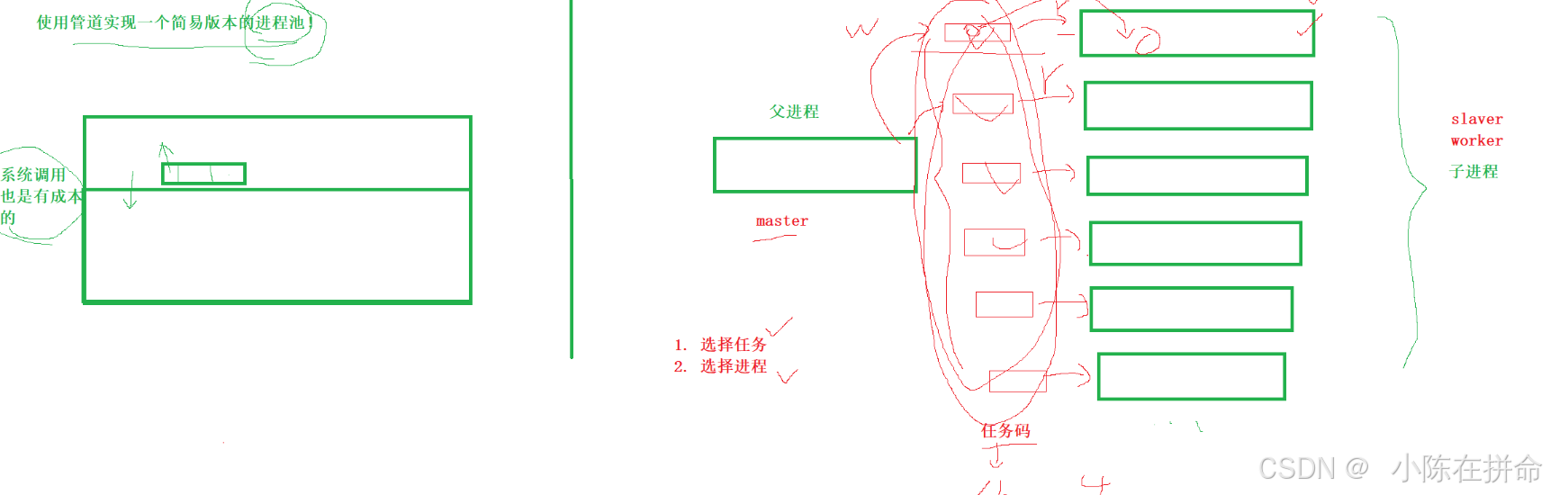 因为每一次我们要进行进程间通信都需要fork,和操作系统做交互是存在很大成本的,所以我们是不是可以提前fork出几个进程,然后当我们想要使用的时候直接去给他们安排任务,这样就减少了系统调用的次数从而提高了内存申请速度!!