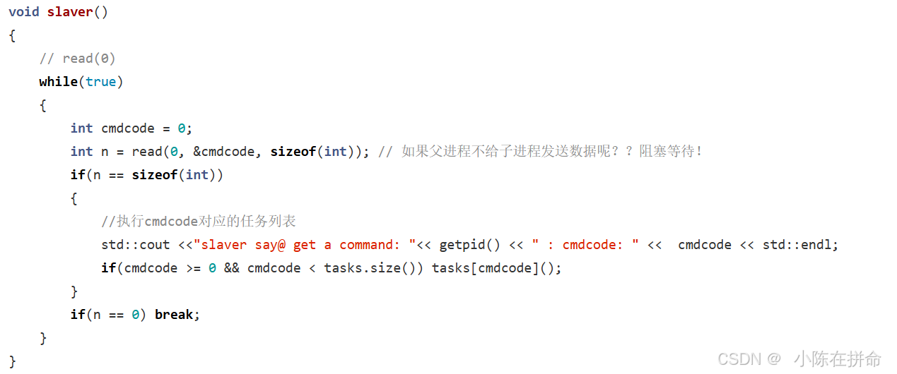 int n = read(0, &cmdcode, sizeof(int)); // 如果父进程不给子进程发送数据呢??阻塞等待!