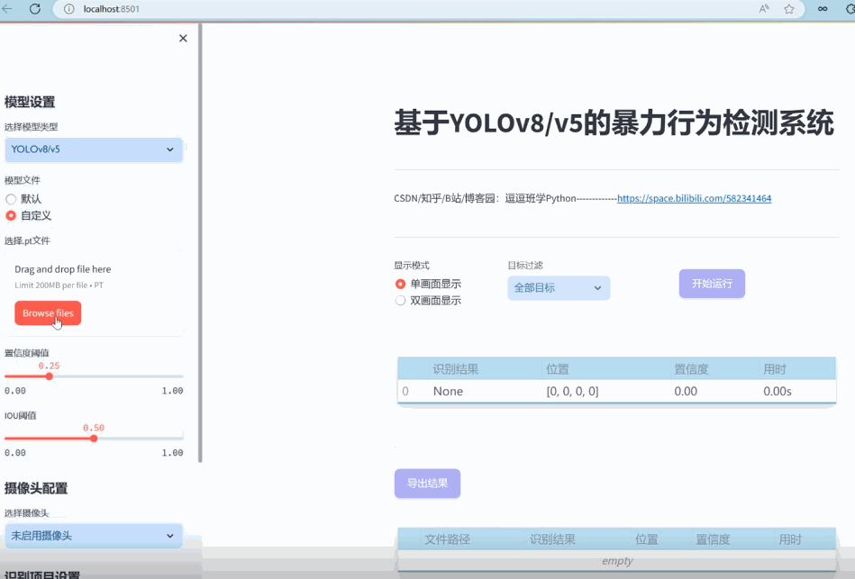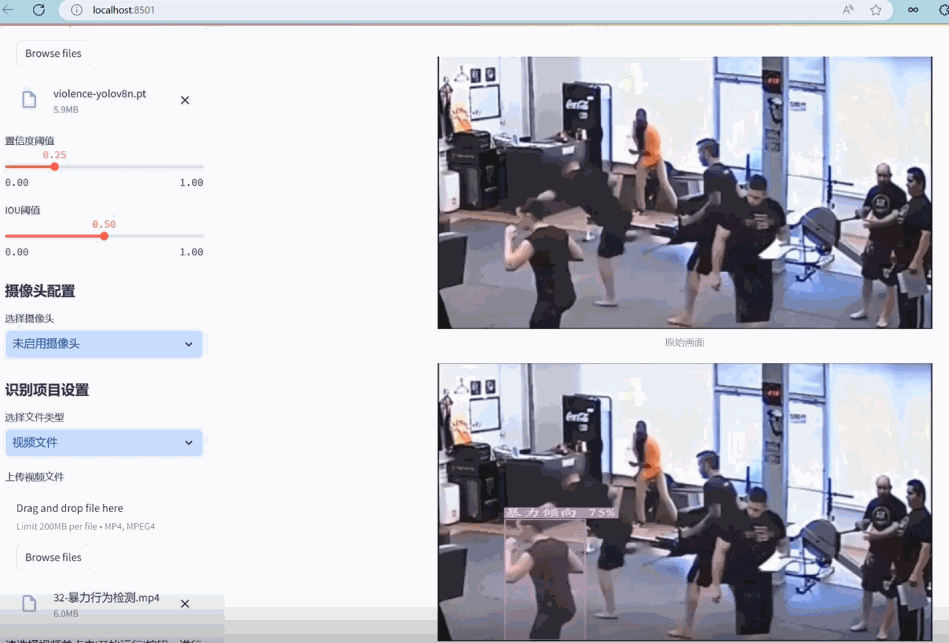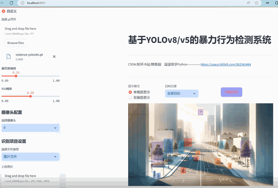美观友好的网页设计:采用Streamlit框架,设计了美观且用户友好的Web界面,支持图像、视频和实时摄像头的暴力行为检测,以及模型的动态切换,大大提升了系统的可用性和互动性。