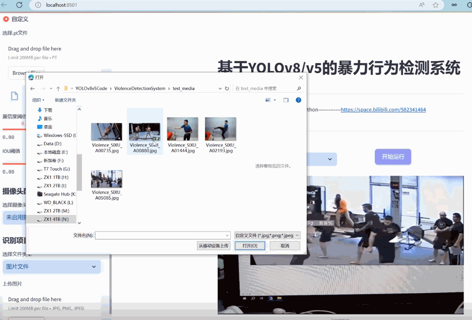 2)选择图片检测:用户可以上传本地的图片文件到系统中进行暴力行为检测。系统会分析上传的图片,识别出图片中的暴力行为,并在界面上展示带有暴力行为标签和置信度的检测结果,让用户能够清晰地了解到每个暴力行为状态。