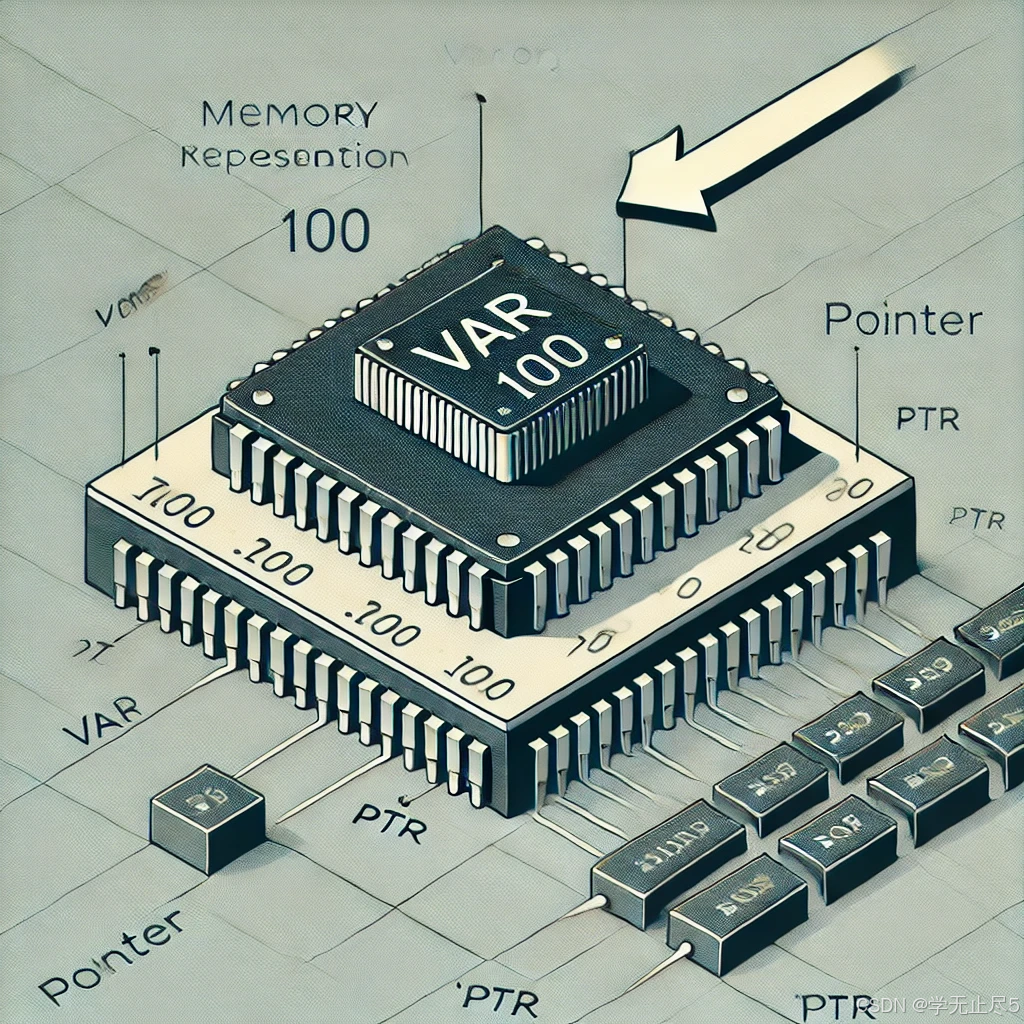 var 所在内存单元,其值为 100。ptr,其值为 var 的地址,箭头指向 var。声明指针时必须指明其指向的变量类型。例如: