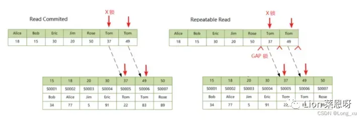 READ COMMITED 隔离级别不会加任何锁,REPEATABLE READ隔离级别会根据ASCII码在未命中索引的前一个索引和后一个索引之间加一个gap 锁。