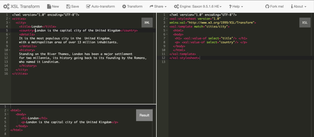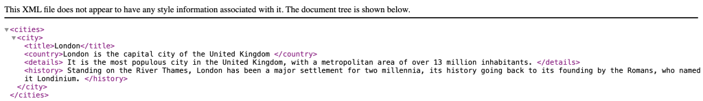 现在,让我们从数据开始。虽然XML已经过时,但它仍然是一种可读的结构化数据形式。可以把它想象成带有过多尖括号的JSON。我们可以用cities.xml表示城市列表中的实际数据(目前只有伦敦):