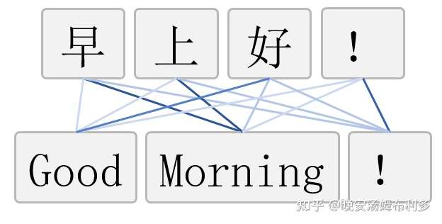 再举一个例子,假如我们想把“早上好!”这句中文翻译成对应的英文“Good Morning!”。我们现在把“早上好!”作为模型输入,“Good Morning!”作为模型输出,那么模型在尝试着拟合输入输出关系的时候,应当可以关注到对于输出的某一部分,输入的不同部分的重要性是不一样的。
