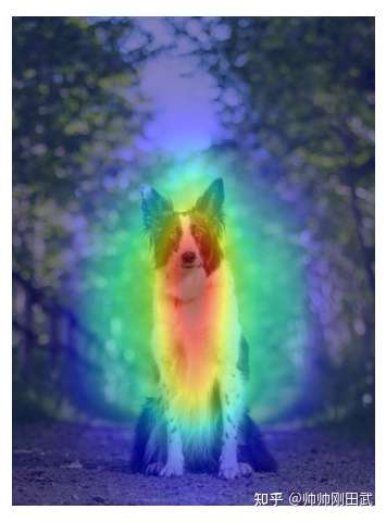 上图中,热力图的颜色越深表示网络对这一区域的关注程度越高。可以看到,边牧面部和前胸区域的颜色较深,但是地面、背景的树等的颜色较浅,这说明神经网络可以学到“不同区域的对于当前任务的重要性不同”。