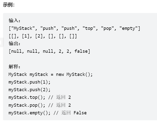 */力扣链接:https://leetcode.cn/problems/implement-stack-using-queues/ 请你仅使用两个队列实现一个后入先出(LIFO)的栈,并支持普通栈的全部四种操作(push、top、pop 和 empty)。