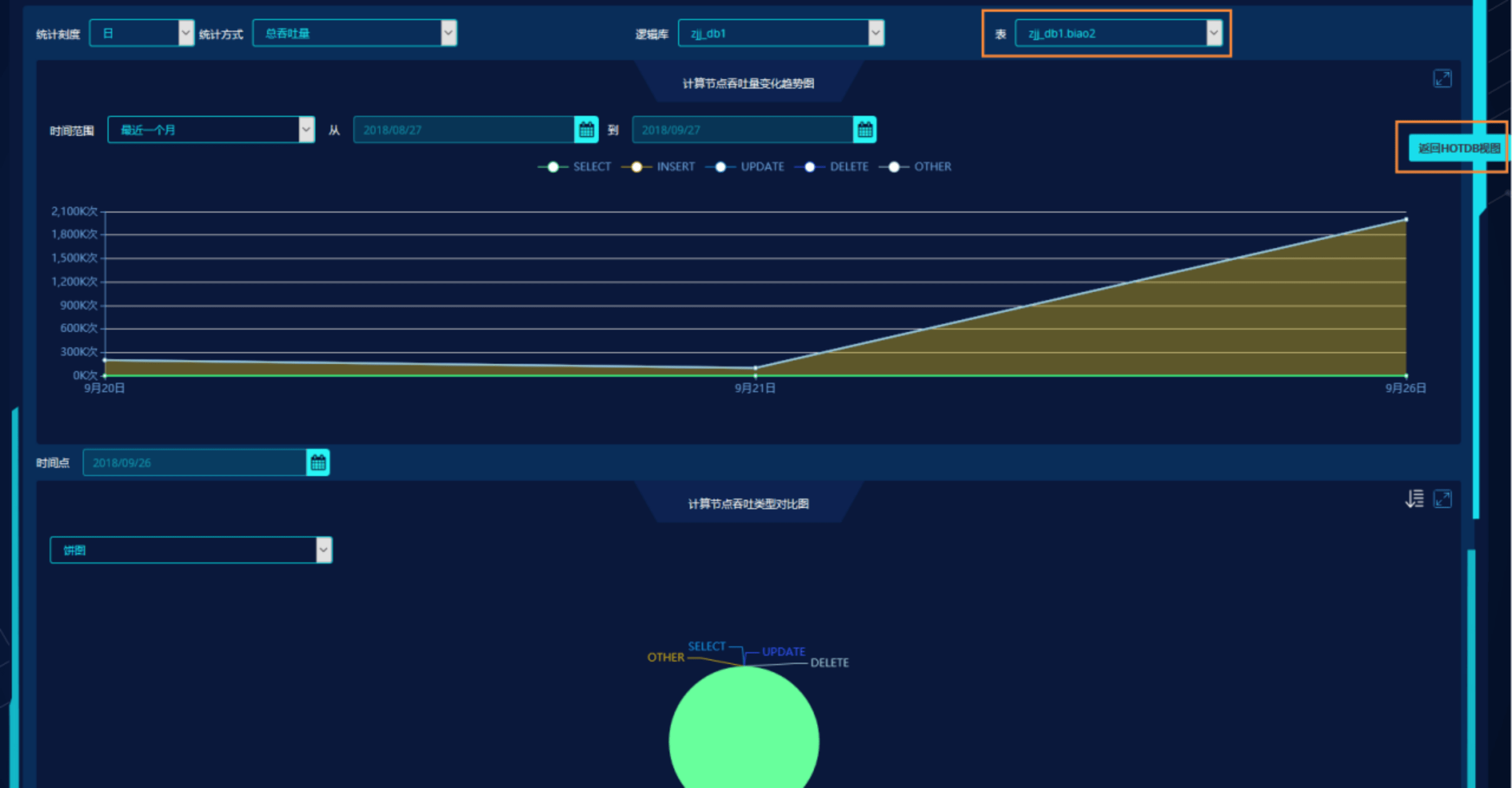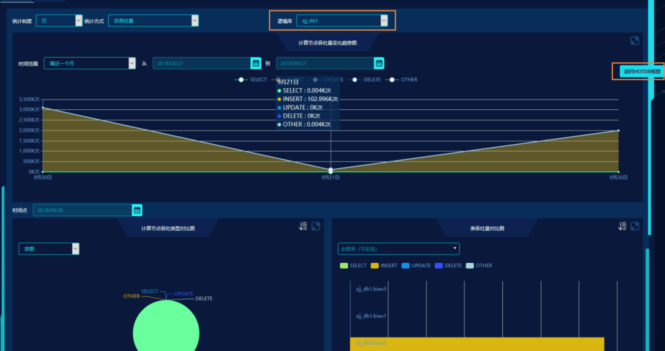 逻辑库维度分为3个图形区。3个图形区统计时间刻度和统计方式一致,支持逻辑库筛选,右上角有【返回计算节点视图】吞吐量报表按钮