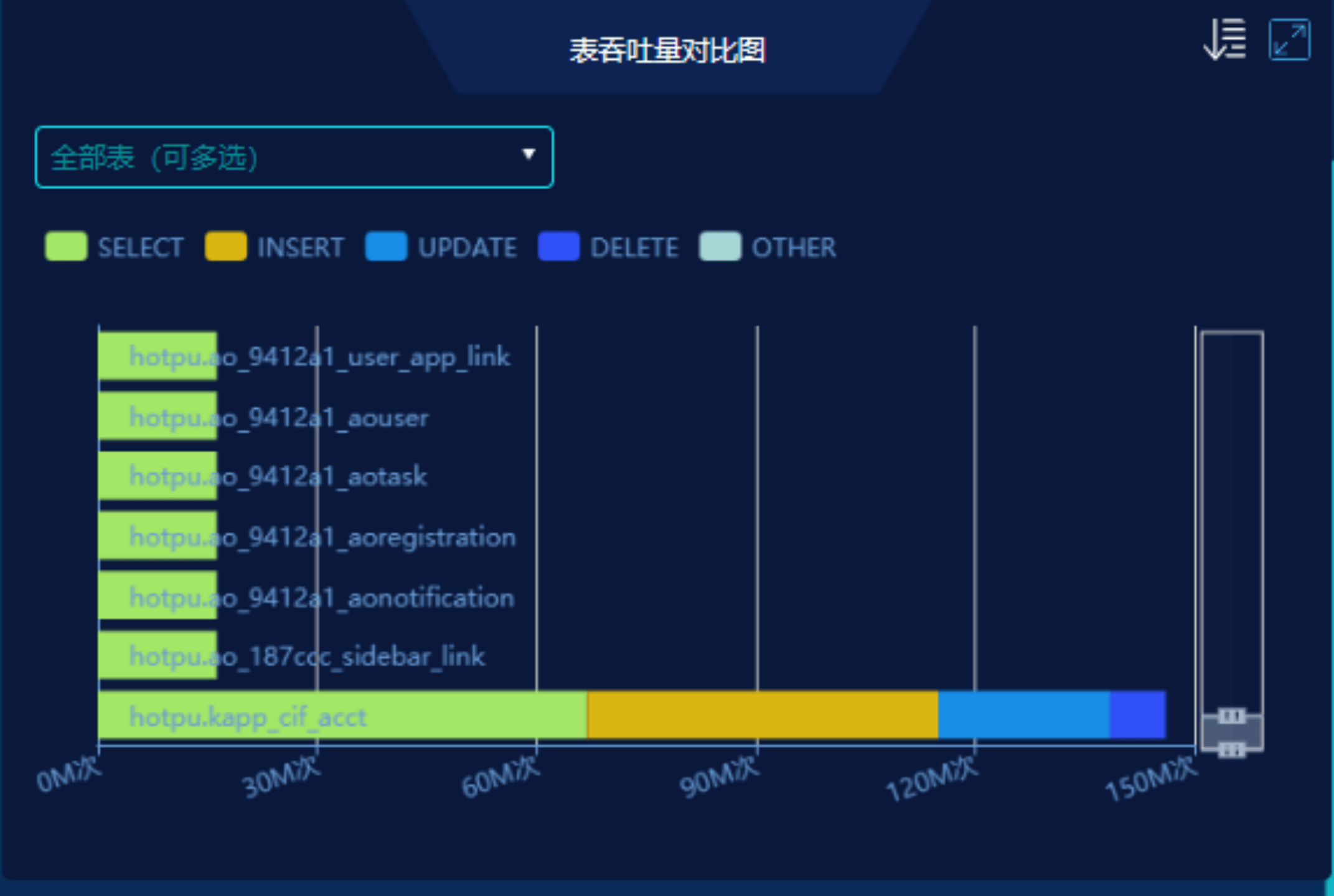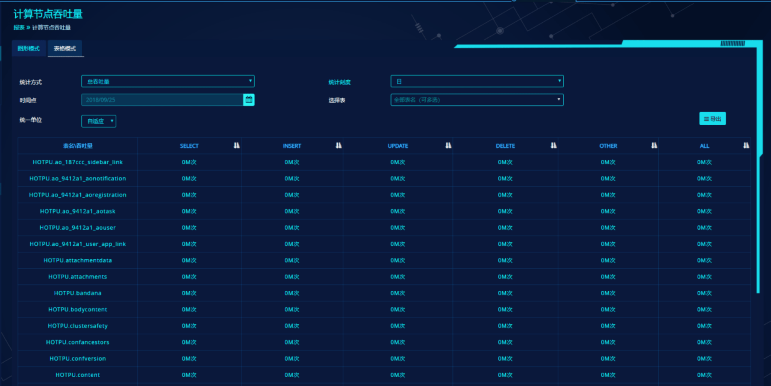 计算节点吞吐量除了使用图形模式展示外,还可以通过表格模式查看。包括整个集群每张表的SELECT、UPDATE、DELETE、INSERT、OTHER五种类型的操作次数。