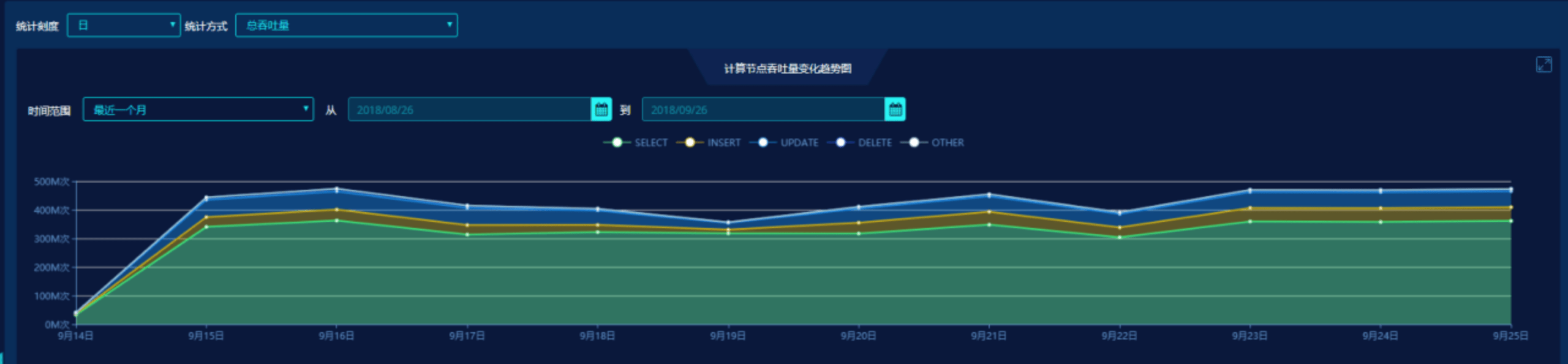 计算节点吞吐量为前端应用发往计算节点的操作量统计,一般用SELECT、UPDATE、DELETE、INSERT、OTHER五种类型分类用户操作。