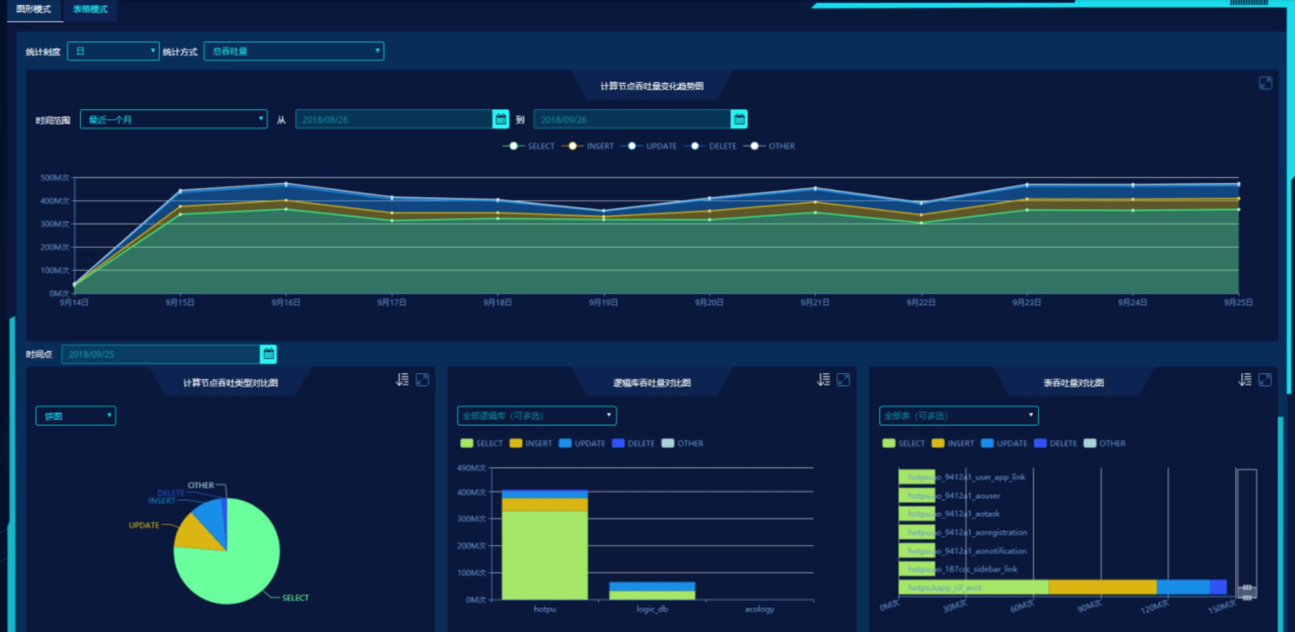 图形模式有四个维度,可显示整个集群的吞吐量情况,也可以选择显示操作类型、逻辑库和表的吞吐量情况。