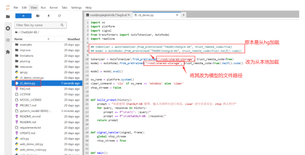 在成功上传并解压预训练模型后,你就可以运行相关的Python脚本了。ChatGLM-6B提供了两个重要的文件:cli_demo.py和web_demo.py,分别用于命令行和网页交互。为了使用本地模型,你需要将代码中的Hugging Face Hub路径替换成本地文件路径。这一步骤能够确保模型在本地环境中顺利运行,为你的项目提供支持和灵活性。