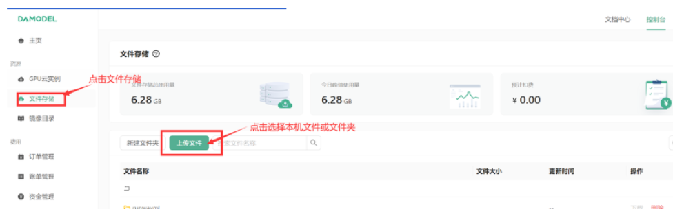 在依赖安装完成后,我们需要导入模型文件。令这些空间被挂载在实例的/root/shared-storage目录下,并且可以被不同的实例共享。用户只需进入文件存储界面,选择上传文件,即可轻松完成数据的导入。这种便捷的设计为项目的启动和管理提供了极大便利。