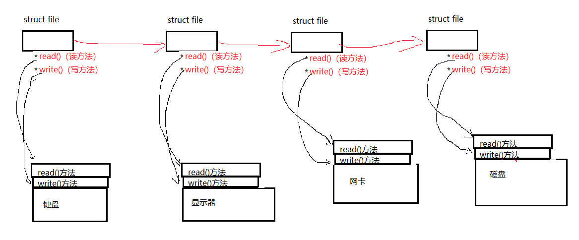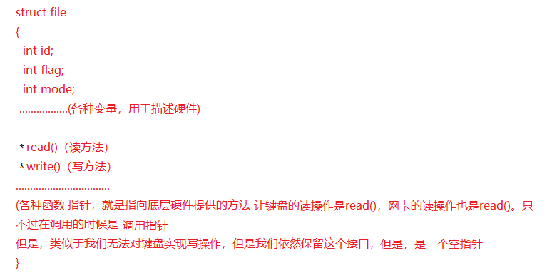 其实上一切皆文件,就是封装的结果,利用形式上完全一模一样的结构体对各种硬件进行描述,让其截然不同的操作封装硬件提供的接口上(读写。。操作,每一个硬件都封装了这样的函数)通过,函数指针指向接口,其中的返回值,函数指针名等都一致,只是函数的底层实现不一样罢了。这样底层的不一致就被屏蔽了,在我们使用者看来就是一切皆文件了,也就是一切皆struct file