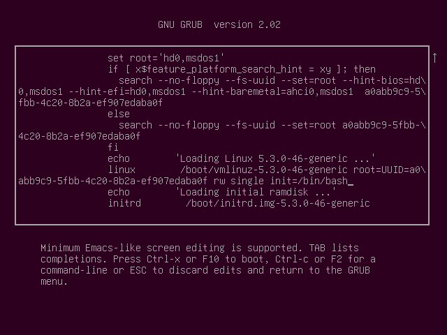 按e进入,找到Linux的那行,将ro那一行后面的内容全部删掉,变成rw single init=/bin/bash (这个是进入单用户模式)