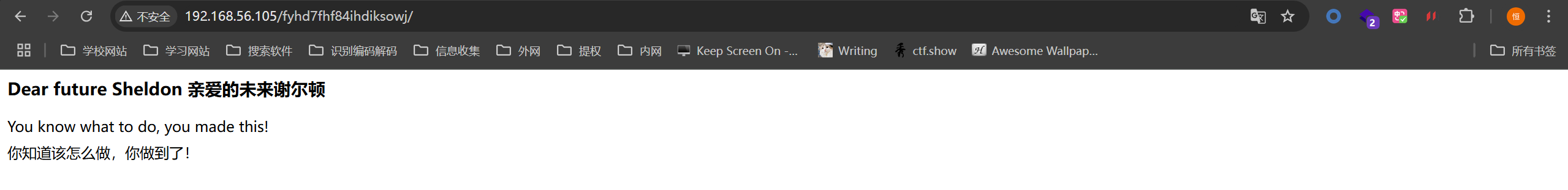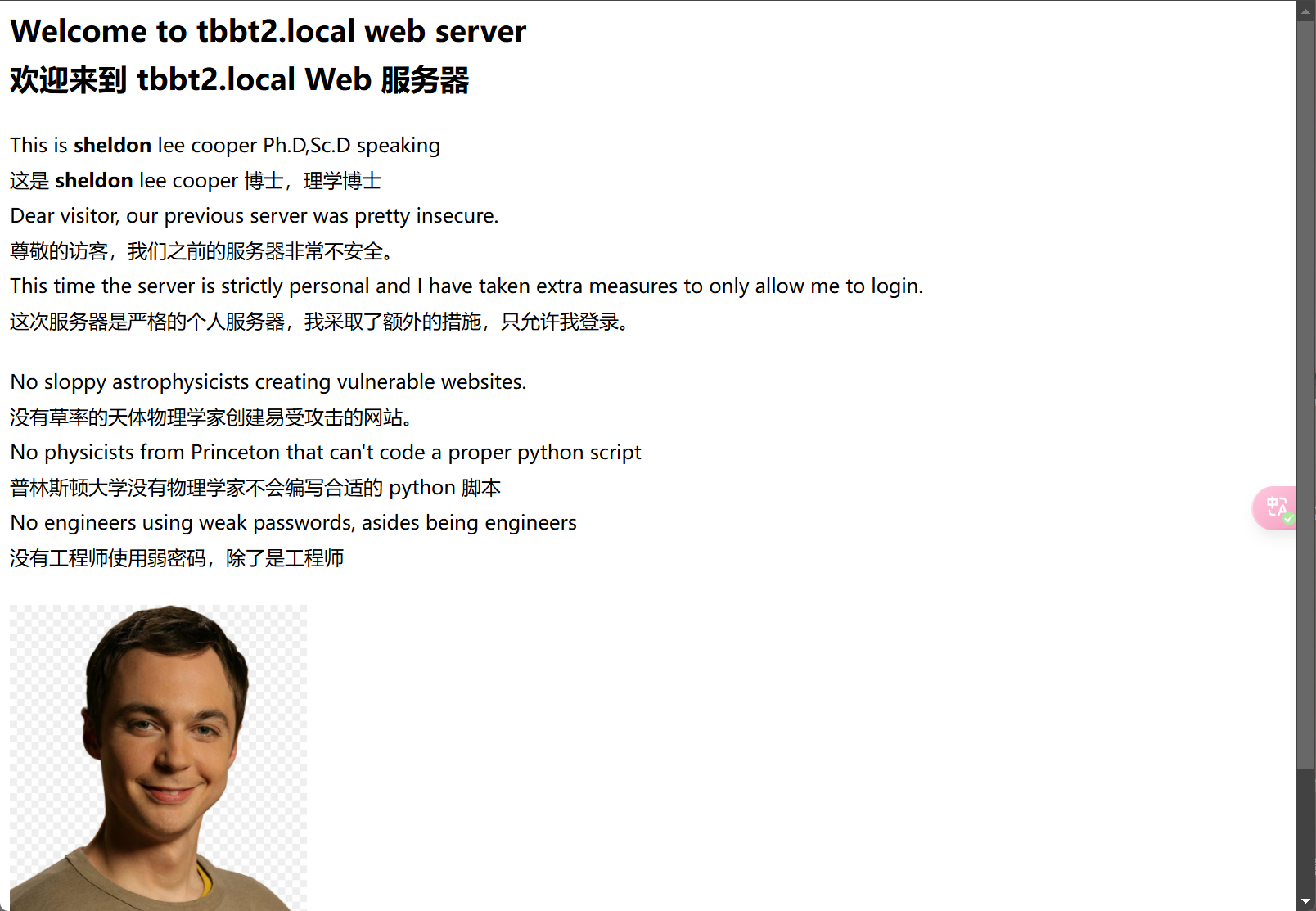 ┌──(kali㉿kali)-[~/daba/TBBT2]└─$ sudo nmap -sT -script=vuln -p 21,80 10.0.2.5 [sudo] password for kali: Starting Nmap 7.94SVN ( https://nmap.org ) at 2024-11-30 07:57 ESTNmap scan report for 10.0.2.5Host is up (0.00056s latency).PORT STATE SERVICE21/tcp closed ftp80/tcp open http|\_http-dombased-xss: Couldn't find any DOM based XSS.|\_http-csrf: Couldn't find any CSRF vulnerabilities.|\_http-stored-xss: Couldn't find any stored XSS vulnerabilities.| http-enum: |\_ /secret/: Potentially interesting folderMAC Address: 08:00:27:E2:19:54 (Oracle VirtualBox virtual NIC)Nmap done: 1 IP address (1 host up) scanned in 30.81 seconds |访问80端口,页面是对服务器的名字和拥有者的介绍,这里可以知道使用者叫sheldon