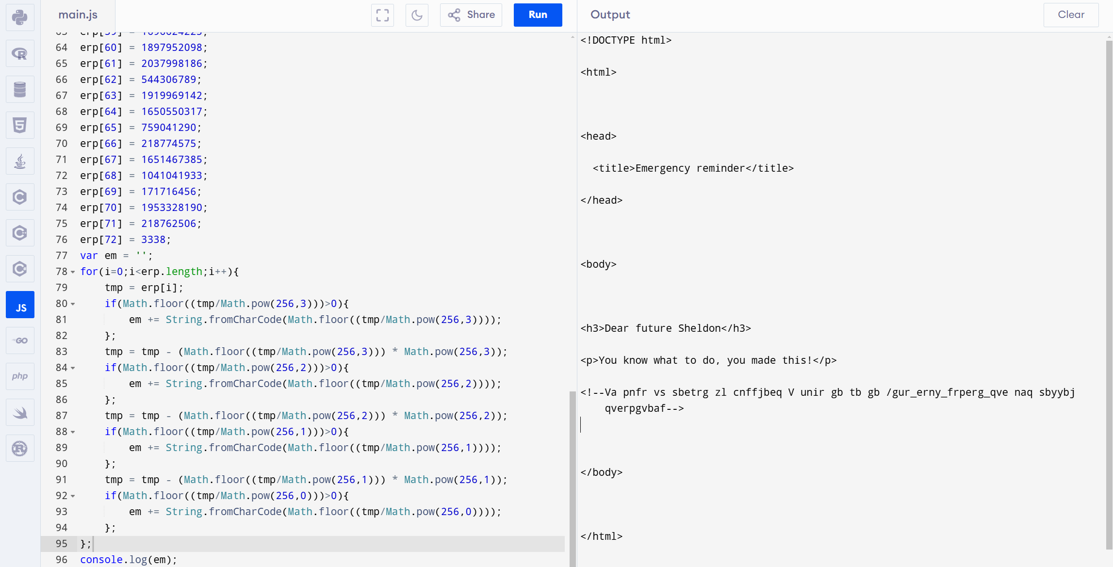good luck with deobfuscation// the easy way or the hard way? which one will you take?var erp = new Array;erp[0] = 1008813135;erp[1] = 1129601360;erp[2] = 1159751796;erp[3] = 1835810317;erp[4] = 171731060;erp[5] = 1835810317;erp[6] = 168626748;erp[7] = 1751474532;erp[8] = 1041041952;erp[9] = 540832873;erp[10] = 1953260862;erp[11] = 1164797298;erp[12] = 1734700643;erp[13] = 2032169573;erp[14] = 1835626084;erp[15] = 1701985327;erp[16] = 1953068140;erp[17] = 1698565386;erp[18] = 1009739877;erp[19] = 1633959437;erp[20] = 168626748;erp[21] = 1651467385;erp[22] = 1041041933;erp[23] = 171730995;erp[24] = 1044669793;erp[25] = 1914726005;erp[26] = 1953854053;erp[27] = 542337125;erp[28] = 1818521454;erp[29] = 1009739827;erp[30] = 1041041980;erp[31] = 1883134319;erp[32] = 1965058926;erp[33] = 1870078071;erp[34] = 1751217184;erp[35] = 1953439844;erp[36] = 1865162873;erp[37] = 1869946989;erp[38] = 1633969440;erp[39] = 1952999795;erp[40] = 557592432;erp[41] = 1041041980;erp[42] = 556608854;erp[43] = 1629515886;erp[44] = 1718755446;erp[45] = 1931506530;erp[46] = 1702130279;erp[47] = 544893984;erp[48] = 1668179558;erp[49] = 1784833393;erp[50] = 542515317;erp[51] = 1852404256;erp[52] = 1734484084;erp[53] = 1646290786;erp[54] = 539977589;erp[55] = 1918854514;erp[56] = 1853448038;erp[57] = 1919968626;erp[58] = 1734308214;erp[59] = 1696624225;erp[60] = 1897952098;erp[61] = 2037998186;erp[62] = 544306789;erp[63] = 1919969142;erp[64] = 1650550317;erp[65] = 759041290;erp[66] = 218774575;erp[67] = 1651467385;erp[68] = 1041041933;erp[69] = 171716456;erp[70] = 1953328190;erp[71] = 218762506;erp[72] = 3338;var em = '';for(i=0;i<erp.length;i++){ tmp = erp[i]; if(Math.floor((tmp/Math.pow(256,3)))>0){ em += String.fromCharCode(Math.floor((tmp/Math.pow(256,3)))); }; tmp = tmp - (Math.floor((tmp/Math.pow(256,3))) \* Math.pow(256,3)); if(Math.floor((tmp/Math.pow(256,2)))>0){ em += String.fromCharCode(Math.floor((tmp/Math.pow(256,2)))); }; tmp = tmp - (Math.floor((tmp/Math.pow(256,2))) \* Math.pow(256,2)); if(Math.floor((tmp/Math.pow(256,1)))>0){ em += String.fromCharCode(Math.floor((tmp/Math.pow(256,1)))); }; tmp = tmp - (Math.floor((tmp/Math.pow(256,1))) \* Math.pow(256,1)); if(Math.floor((tmp/Math.pow(256,0)))>0){ em += String.fromCharCode(Math.floor((tmp/Math.pow(256,0)))); };};document.write(em); |document.write()方法用于写入由 document.open() 打开的文档流(document stream),可以传多个参数,写入的字符串会按HTML解析。