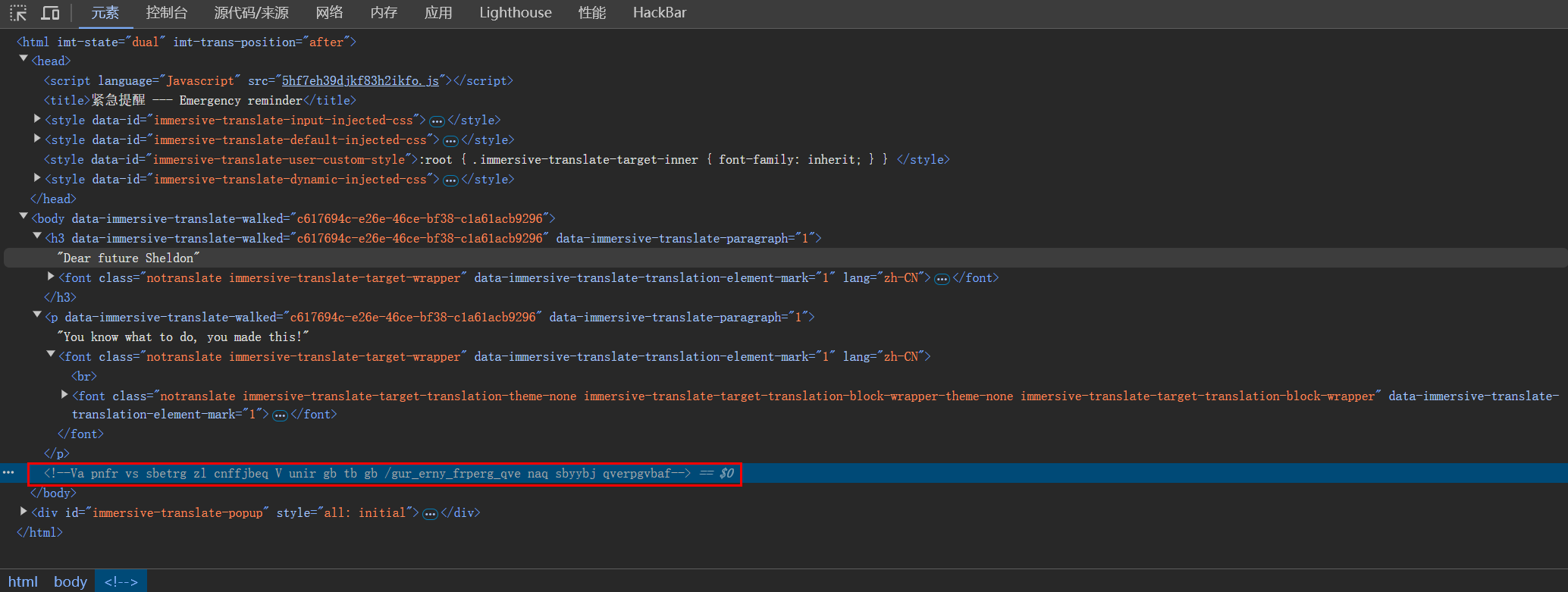 返回页面,按F12查看页面资源,也能看到这段话<!--Va pnfr vs sbetrg zl cnffjbeq V unir gb tb gb /gur\_erny\_frperg\_qve naq sbyybj qverpgvbaf-->