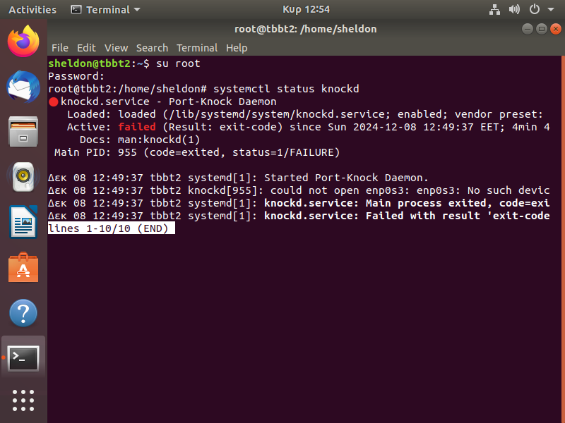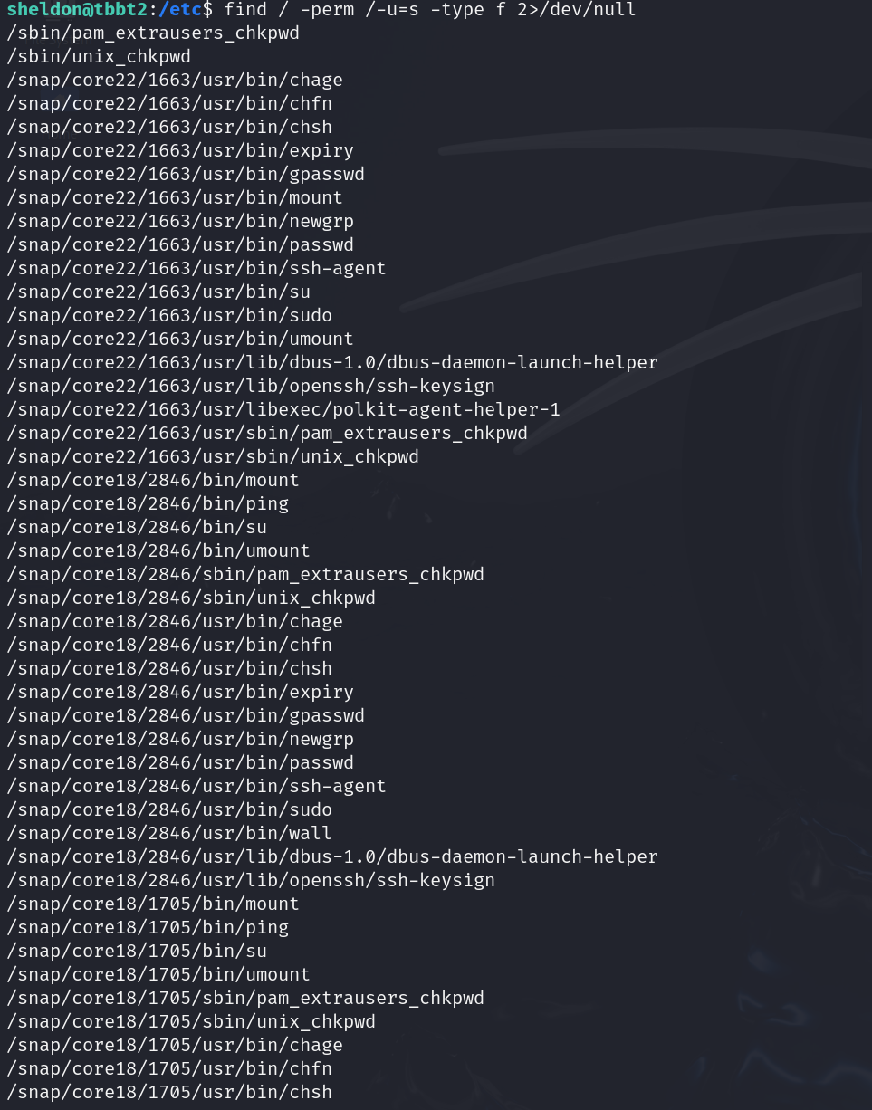 ┌──(kali㉿kali)-[~/daba/TBBT2]└─$ knock 10.0.2.5 1000 2000 3000 -u ┌──(kali㉿kali)-[~/daba/TBBT2]└─$ ssh sheldon@10.0.2.5 sheldon@10.0.2.5's password: Welcome to Ubuntu 18.04.4 LTS (GNU/Linux 5.4.0-150-generic x86\_64) \* Documentation: https://help.ubuntu.com \* Management: https://landscape.canonical.com \* Support: https://ubuntu.com/advantage \* Strictly confined Kubernetes makes edge and IoT secure. Learn how MicroK8s just raised the bar for easy, resilient and secure K8s cluster deployment. https://ubuntu.com/engage/secure-kubernetes-at-the-edge \* Canonical Livepatch is available for installation. - Reduce system reboots and improve kernel security. Activate at: https://ubuntu.com/livepatch132 packages can be updated.3 updates are security updates.Your Hardware Enablement Stack (HWE) is supported until April 2023.Last login: Sat Nov 30 09:13:04 2024 from 10.0.2.4sheldon@tbbt2:~$ |或者也可以用nmap来敲门