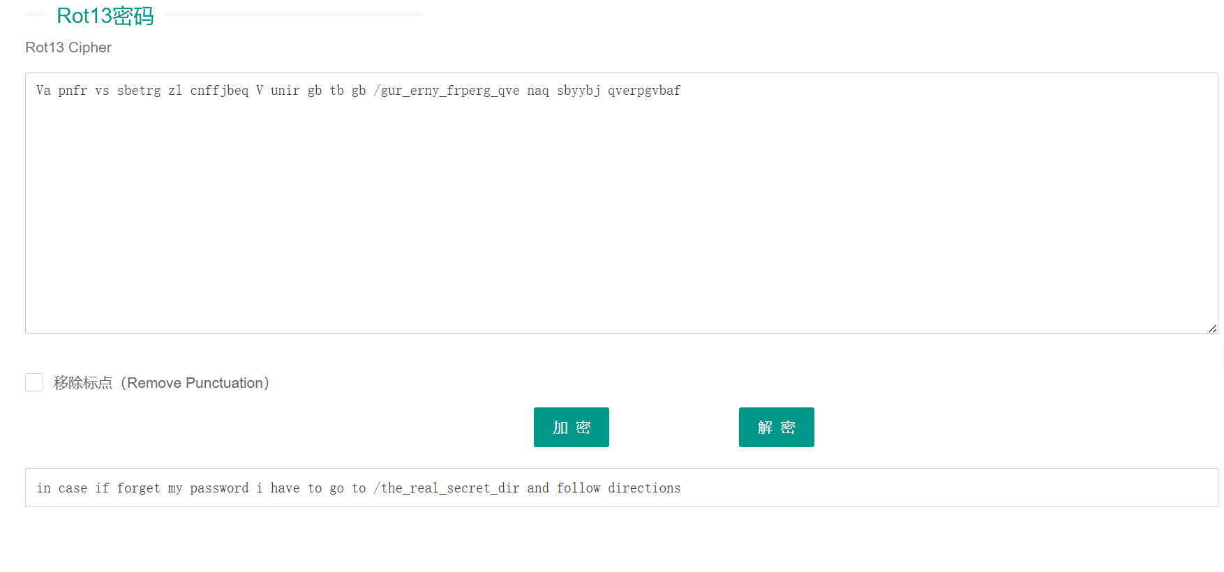尝试各种解密,并且这个全部都是字符串减少了很多种可能性,最后经过尝试发现是rot13(ROT13 加密算法是将明文中的每个字母按照字母表的顺序向后移动 13 位来进行加密),这个东西有一个特点,无论是加密还是解密得到的答案是一样的,可能是字母表26位再加上13位的加减导致的。