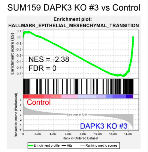 这个图是一个基因集富集分析(Gene Set Enrichment Analysis, GSEA)的结果图,通常用于确定在两个不同条件下(如实验组与对照组)基因表达模式的差异是否显著。在这个例子中,比较的是SUM159细胞系中DAPK3基因敲除(KO #3)与对照组的差异。