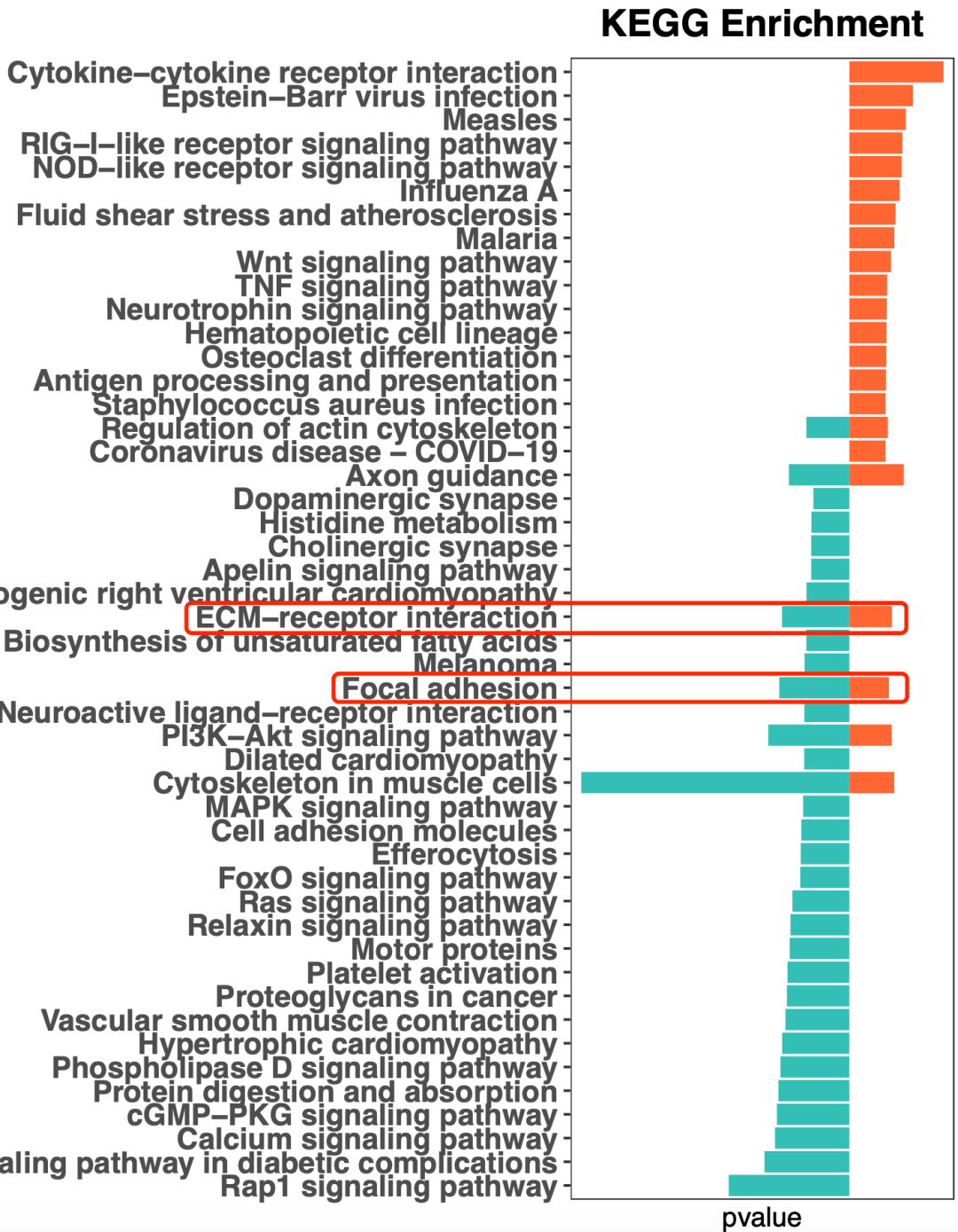 综上所述,上下调基因分开注释就应该有生物学功能的重叠,一切合情合理,如果上下调基因注释到了同一个生物学功能,比如ECM−receptor interaction和Focal adhesion 这两个通路,或者癌症的EMT,其实是应该是具体情况具体分析,因为这个功能本来就是一个大锅饭,emt可以区分为e和m两个完全不一样的,ECM−receptor interaction也是可以拆分成为4个子集。