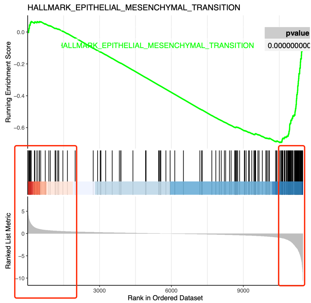 之所以有这样的一个作业,其实是因为这里面又蕴涵着另外一个大家很容易弄错的知识点,就是如何理解生物学功能的上下调问题,文章里面的EMT通路的GSEA如下所示 :