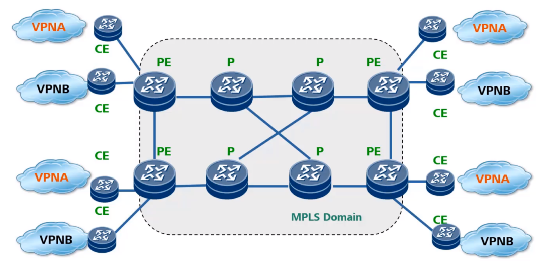 MPLS提供了低开销的服务底层,只有PE路由器(Provider Edge, PE)需要为L3VPN传输完整的Internet路由表和虚拟路由转发(Virtual Routing and Forwarding, VRF)。