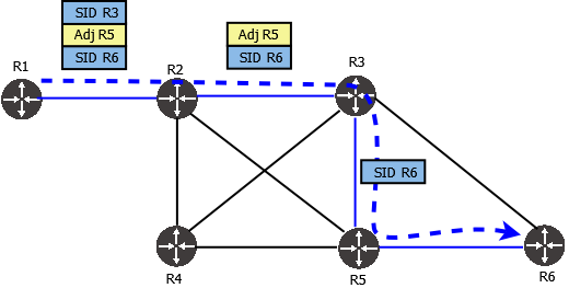 在上图所示的拓扑中,为了通过蓝色链路将数据包从 R1 转发到 R6,R1 会推送三个标签: