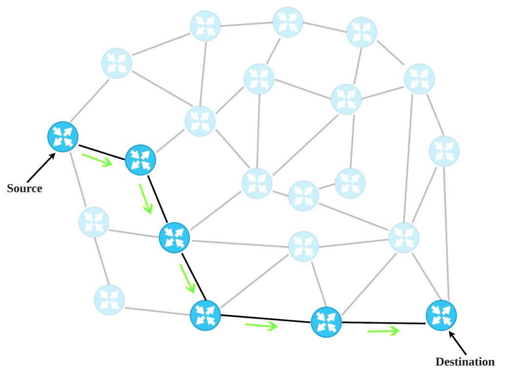 使用SR进行流量工程时,与RSVP不同,SR不会向LSP发出信号,而是通过添加多个SID来沿流量工程路径转发数据包。SR的无状态特性意味着正确的流量工程需要一个控制器。没有控制器,就无法使用带宽预留,虽然可以使用约束最短路径优先(Constrained Shortest Path First, CSPF)进行流量工程,但这需要路由器上的额外功能。