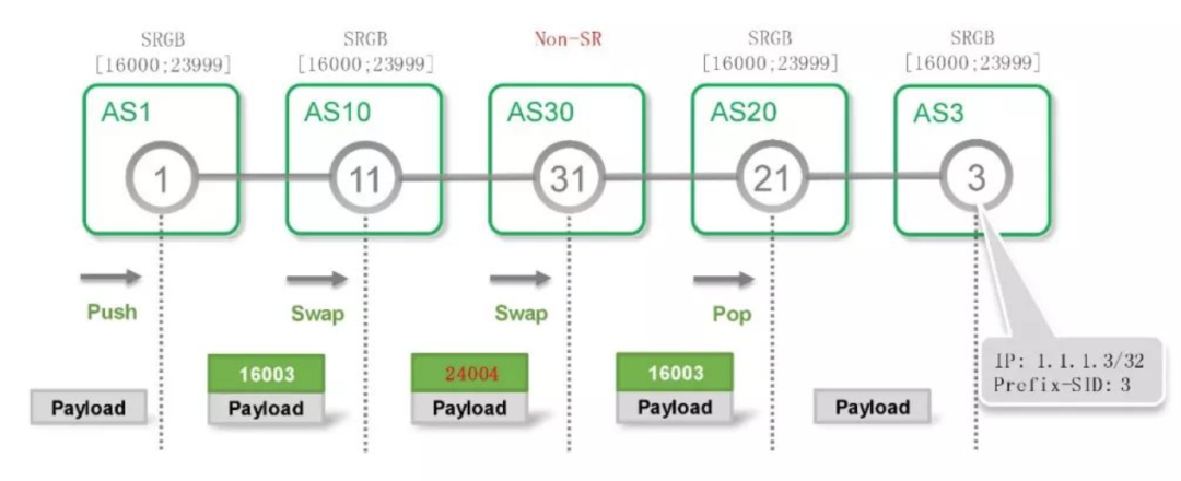 与传统网络技术不同的是,SR它摒弃了传统的标签分发机制,通过向IS-IS和OSPF添加扩展,通告分段ID(Segment Identifier, SID)以及链路和前缀信息,不再有“标签切换”。入口 LER 只是将出口 LER 的 SID 推送到数据包上,所有中转 LSR 都不会更改该标签(至少在理论上,实际实施仍会使用相同的标签交换标签)。