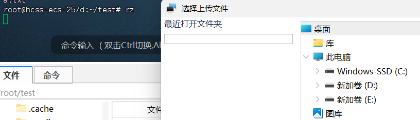 输入 rz 后就会弹出一个框,用来选择要将哪个 windows 中的文件上传到 Linux 中