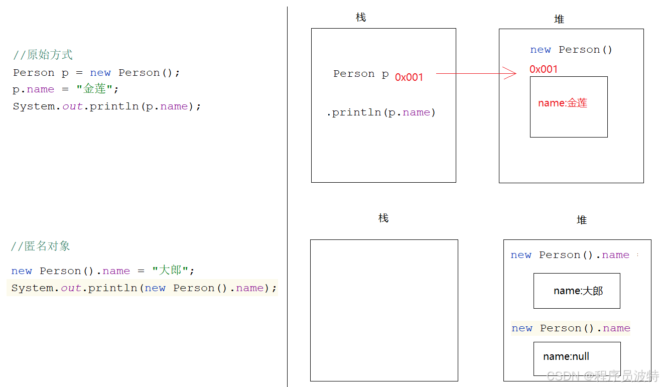 c.等号右边的new Person():真正的数据,是一个Person对象,将这个对象真正创建出来了 1.所谓的匿名对象:其实就是没有等号左边的部分,只有等号右边的部分(对象)