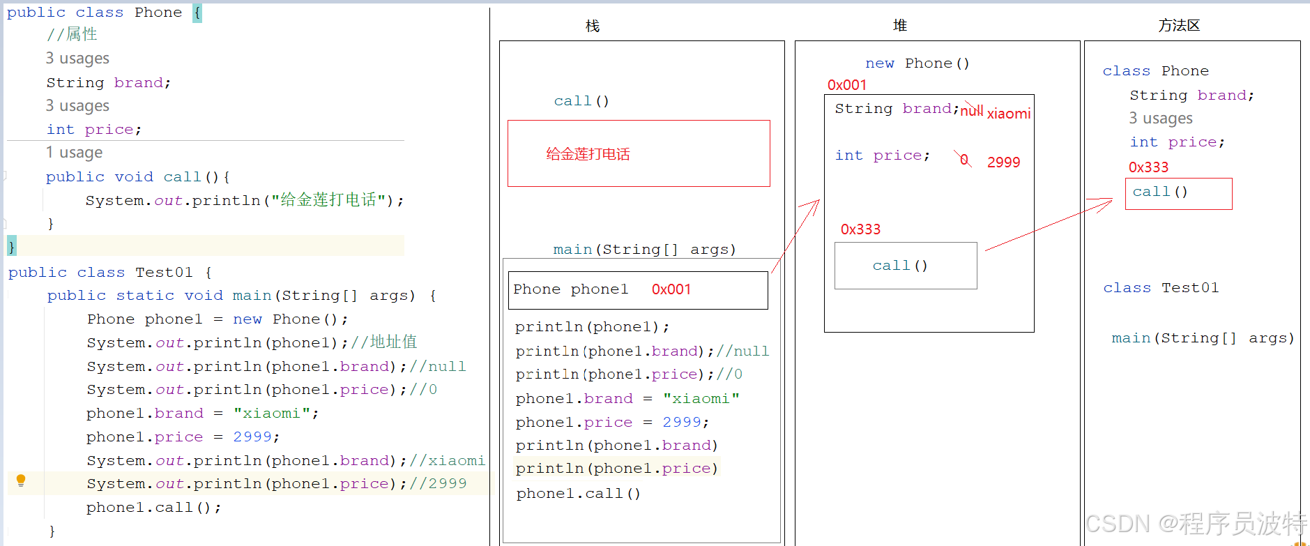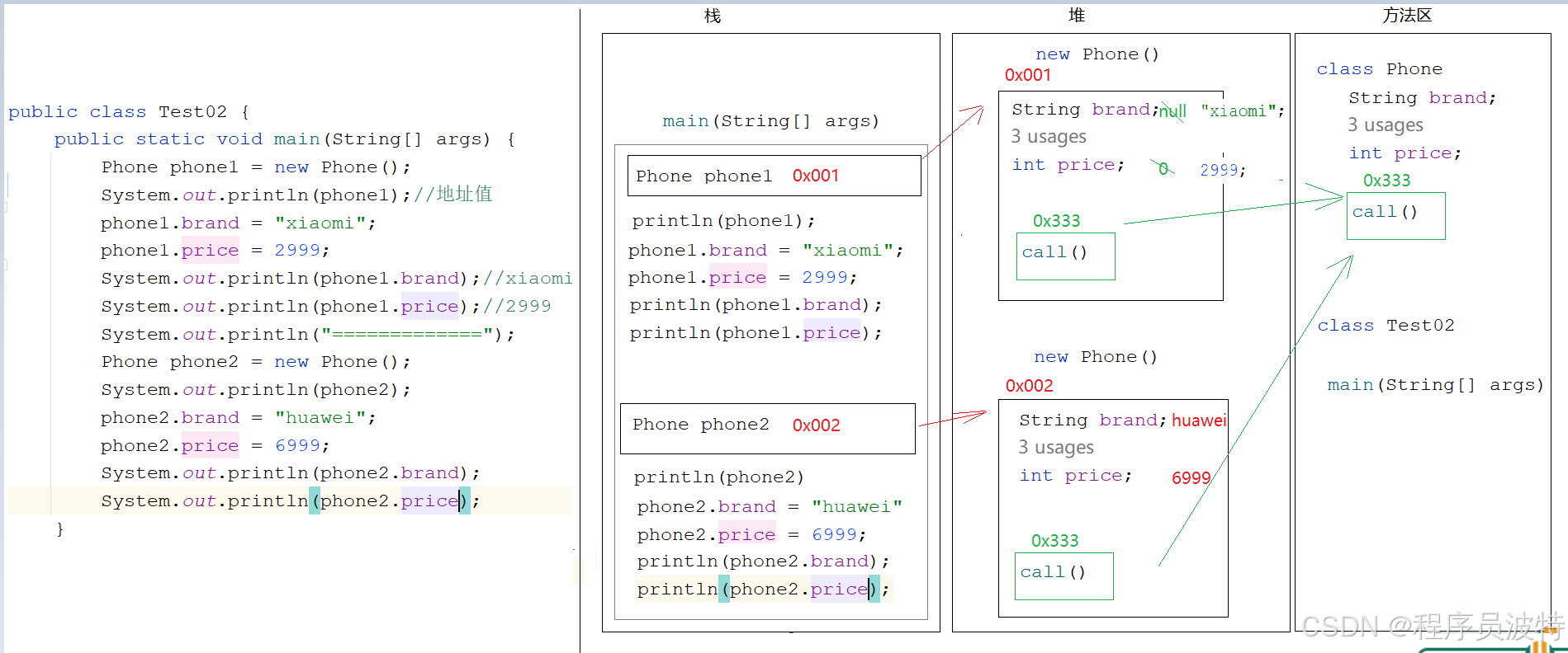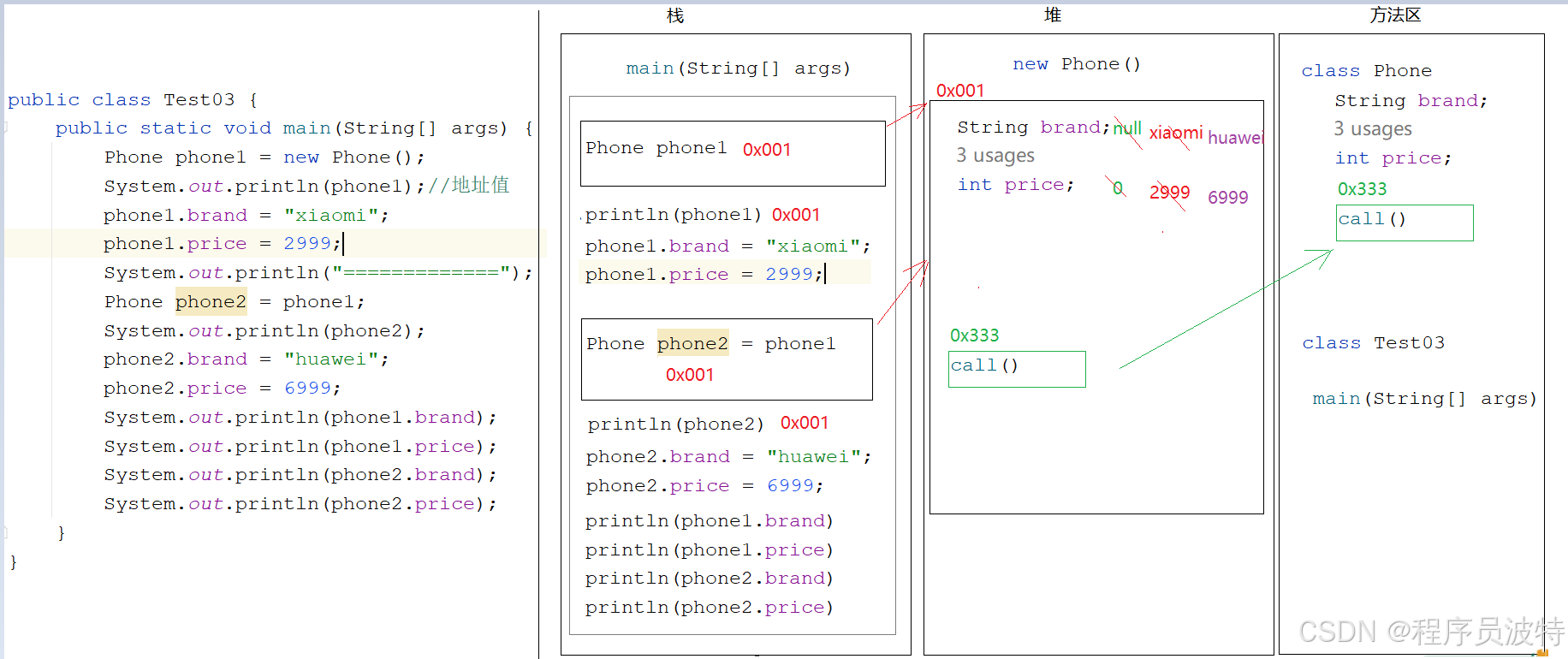 phone2是phone1给的,phone1在内存中保存的是地址值,此时phone1和phone2地址值是一样的了,操作的是同一片空间的数据,所以改变一个对象的数据会影响到另外一个对象