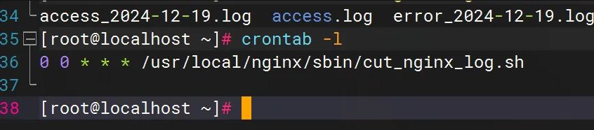 0 0 * * * /usr/local/nginx/sbin/cut_nginx_log.sh/usr/local/nginx/sbin/cut_nginx_log.shls /usr/local/nginx/logs/预期输出:日志目录中应出现 access_<日期>.log 和 error_<日期>.log 文件。