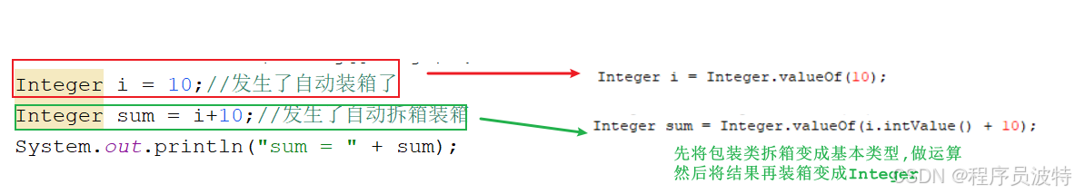 Integer sum = i + 10; // 发生了自动拆箱装箱