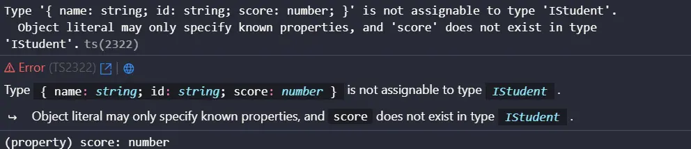 const stu1: IStudent = { name: "https://www.cnblogs.com/jasongrass/", id: "123", score: 90 // error}来看 stu1 的定义,stu1 是一个标识符,一个指向对象的引用,而且这个对象的初始化引用类型,被定义成了 IStudent(其中没有 score 这个属性的定义) 这意味着,在后续使用中,无法通过 stu1 访问到 score 这个属性,这通常意味着代码错误或者设计不合理。