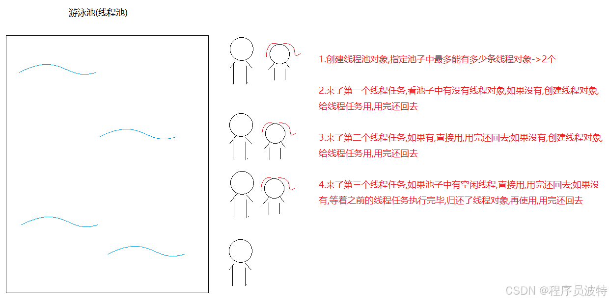 问题:之前来一个线程任务,就需要创建一个线程对象去执行,用完还要销毁线程对象,如果线程任务多了,就需要频繁创建线程对象和销毁线程对象,这样会耗费内存资源,所以我们就想线程对象能不能循环利用,用的时候直接拿线程对象,用完还回去