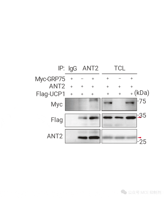 图 4. 外源 GRP75 可增强 ANT2-UCP1 的相互作用[6]。
