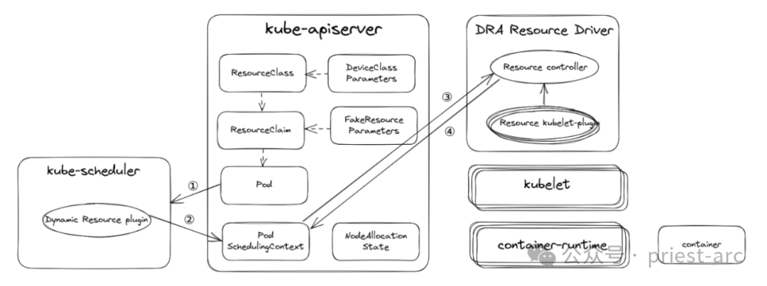 为了有效克服上述局限性,Kubernetes 引入了动态资源分配(DRA)机制。DRA 的核心目标是确保应用程序能够在恰当的时机获得所需数量的资源。“动态资源分配 API”将持久卷 API 的设计理念扩展到通用资源的管理,例如 GPU 等。它支持基于实时需求和预设配置进行动态的资源调整,从而最大程度地减少人工干预的需求。