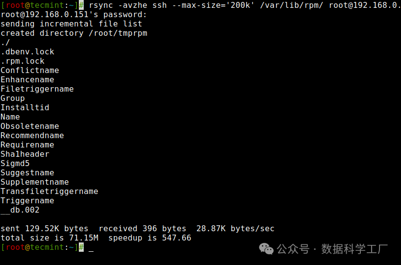 [root@tecmint:~/rpm]# rsync -avz --delete root@192.168.0.151:/var/lib/rpm/ /root/rpm/